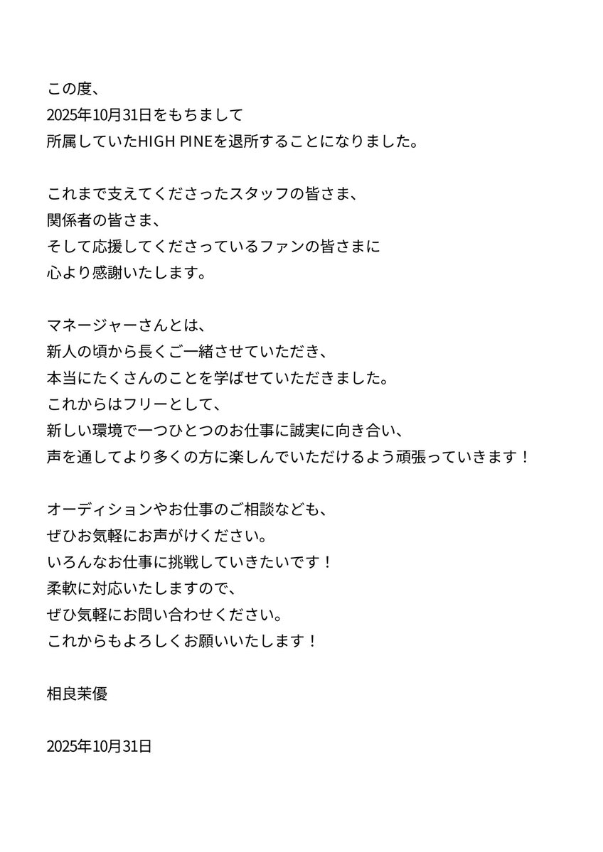 相良茉優さん退所【声優】
