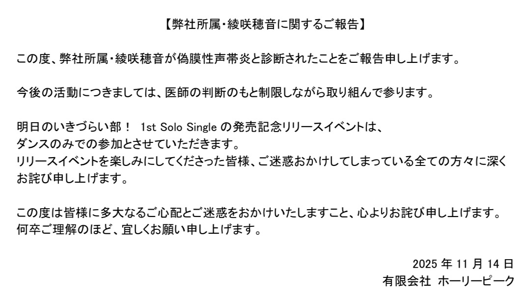 高橋ポルカ役・綾咲穂音につきまして、偽膜性声帯炎の診断を受け15日に開催いたします「いきづらい部! 1st Solo Single発売記念リリースイベント(応募抽選)」出演にあたり、症状に配慮し発声を控え、既存の歌唱音源を使用させていただきます。…
