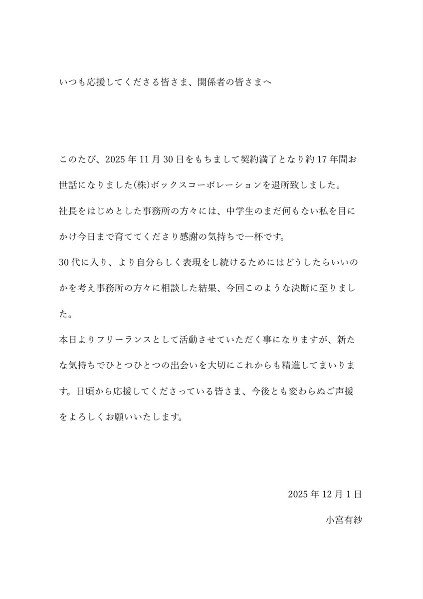 小宮有紗【ご報告】 ネタ・雑談 2025年12月1日 13:00 2 0 1: ◆bKGKF1OJ★ 2025/12/01(月) 11:59:56 ID:???00 0 2: ◆bKGKF1OJ★ 2025/12/01(月) 12:00:12 ID:???00 2 3: ◆hFpFjKgp★ 2025/12/01(月) 12:01:39 ID:???Sp ヨーコ時代からの付き合いだったもんな今後の幸せを祈っています 0 4: ◆z2xkdLhe★ 2025/12/01(月) 12:01:59 ID:???00 17年かぁ人生の約半分くらいを同じ事務所で過ごしてたんだなぁ 1 5: ◆6WOtRMLE★ 2025/12/01(月) 12:05:10 ID:???00 この方は次のムーブメントが想像つかない役者方面がメインだろうとは思いつつ、他の分野でも何かおもろいものが出てきそうな気がする 0 9: ◆dxa3GHeD★ 2025/12/01(月) 12:28:13 ID:???00 FCはそのままで来年のバースデーは開催決まってるけどその後もファンミ継続してくれるかなぁ 0 5: (しうまい) 2025/12/01(月) 11:37:18.87 ID:T9SSqco0 戦隊シリーズも終わるしな 区切りにしたんだろう 1 14: (たまごやき) 2025/12/01(月) 12:29:12.14 ID:vczSIkR+ ありしゃ将来は事務所立ち上げそう 0 15: (なっとう) 2025/12/01(月) 12:34:30.29 ID:mxqcdBs5 emが退社したらアカウント名(@AyaEmori_BOX)はどうなるの? 0 18: (茸) 2025/12/01(月) 12:42:09.64 ID:0Lw8z968 >>15 それで気付いたけど小宮さんも@box_komiyaarisaだったはず 1 16: (もんじゃ) 2025/12/01(月) 12:38:45.21 ID:ZHTG2ZhX そのあたりは事務所によりけりじゃない アカウントを本人に譲渡してユーザー名を変えるか新規で作り直すか 0 7: ◆mK6JSe7Z★ 2025/12/01(月) 12:12:48 ID:???Sd Aqoursで結成当初から事務所変わってないのは後2人になったのか 引用元: https://nozomi.2ch.sc/test/read.cgi/lovelive/1764556199/ 引用元: https://jbbs.shitaraba.net/bbs/read.cgi/anime/11224/1764557996/
