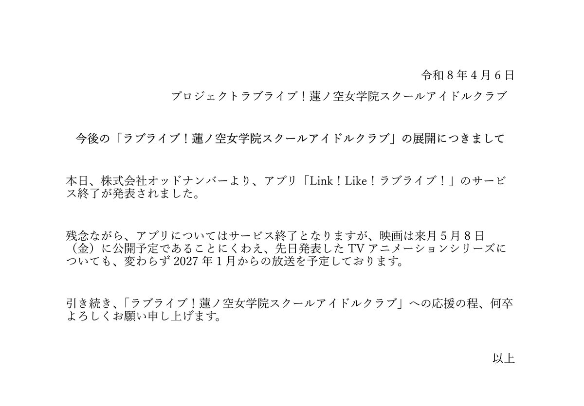 この度、『Link!Like!ラブライブ!』は、2026年6月30日(火) 12:00をもちまして、サービスを終了させていただくこととなりました。